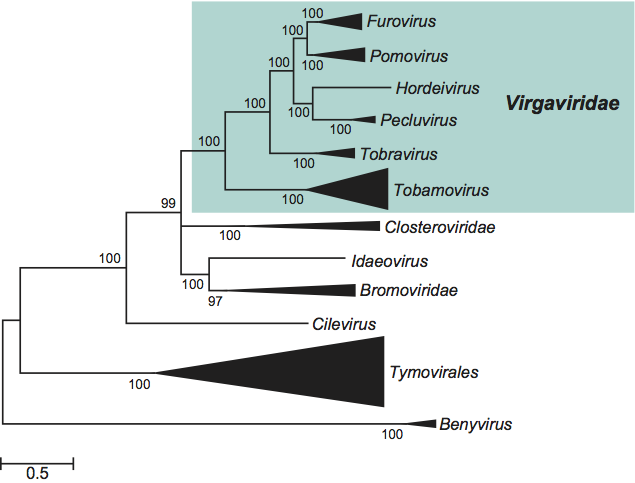 Figure 15 Bayesian phylogenetic tree of the nucleotide sequences of the fused MetHelRdRp domains of the members of the six genera included in the family Virgaviridae together with some other related viruses. A total of 500 amino acid positions corresponding to 1,500 nt positions were used for the alignment. The tree was generated from a back-translated amino-acid alignment using MrBayes v3.1.2, employing the general time reversible model with gamma-shaped rate variation with a proportion of invariable sites; 1,000,000 generations of MCMC analysis were performed, to the point at which the average standard generation of split frequency between two parallel runs had reached 0.009565. Posterior probability values are indicated on the corresponding branches. Nearly identical trees were obtained by neighbour-joining and maximum composite likelihood methods. Genera and families (which are all monophyletic) have been collapsed into a triangle, the length of which corresponds to the variation found within the clade.
