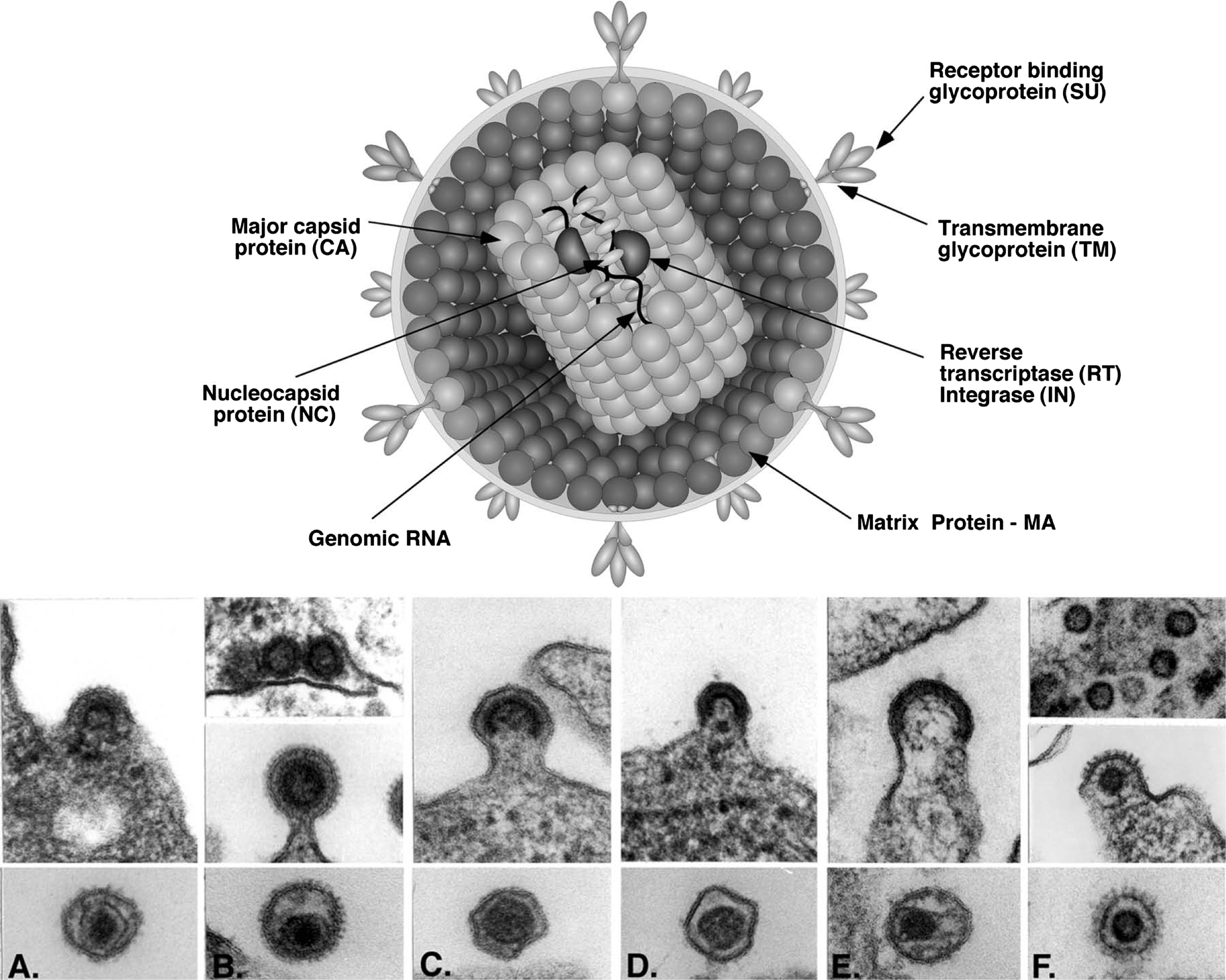 Figure 1 Structure of retrovirus particles. (Top) Schematic cartoon (not to scale) showing the inferred locations of the various structures and proteins. (Bottom) Panel (A): alpharetrovirus, avian leukosis virus (ALV); type C morphology. Panel (B): betaretrovirus, mouse mammary tumor virus (MMTV); type B morphology. Panel (C): gammaretrovirus, murine leukemia virus (MLV). Panel (D): deltaretrovirus, bovine leukemia virus (BLV). Panel (E): lentivirus, human immunodeficiency virus 1 (HIV-1). Panel (F): spumavirus, simian foamy virus (SFVcpz(hu); formerly called HFV).