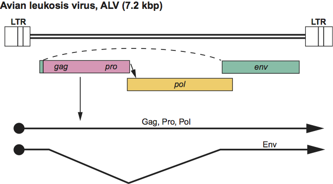 Figure 2 Alpharetrovirus genome expression. The 7.2 kbp avian leukosis virus (ALV) provirus genome is shown, with LTRs, protein-coding regions (gagpropol and env) and transcripts (solid line arrows with protein names added) marked. The arrow between the pro-pol reading frames indicates a ribosomal frameshift.