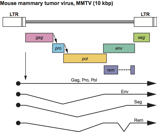 Figure 3 Betaretrovirus genome expression. The 10 kbp mouse mammary tumor virus (MMTV) provirus genome is shown, with LTRs, protein-coding regions (gagpropolenvsag and rem) and transcripts (solid line arrows with protein names added) marked. The arrows between the gag-pro and pro-pol reading frames indicate ribosomal frameshift sites.