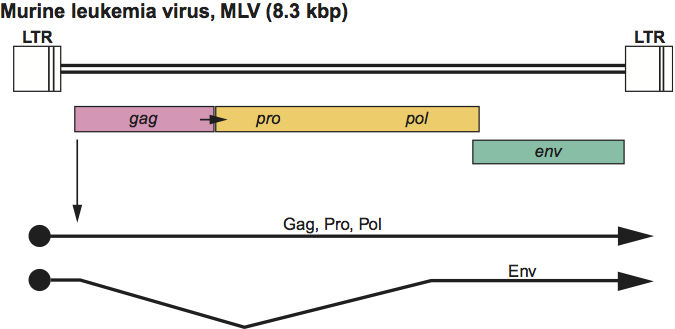 Figure 4 Gammaretrovirus genome expression. The 8.3 kbp murine leukemia virus (MLV) provirus is shown, with LTRs, protein-coding regions (gagpropol and env) and transcripts (solid line arrows with protein names added) marked. The arrow between gag-pro indicates a ribosomal readthrough site.