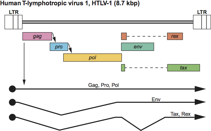 Figure 5 Deltaretrovirus genome expression. The 8.7 kbp human T-lymphotropic virus 1 (HTLV-1) provirus genome is shown, with LTRs, protein-coding regions (gagpropolenvtax and rex) and transcripts (solid line arrows with protein names added) marked. The arrows between the gag-pro and pro-pol reading frames indicate ribosomal frameshift sites.