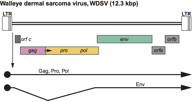 Figure 6 Epsilonretrovirus genome expression. The 12.3 kbp walleye dermal sarcoma virus (WDSV) provirus genome is shown, with LTRs, protein-coding regions (gagpropolenvorf aorf b and orf c) and transcripts (solid line arrows with protein names added) marked. The arrow between gag-pro indicates a ribosomal readthrough site.