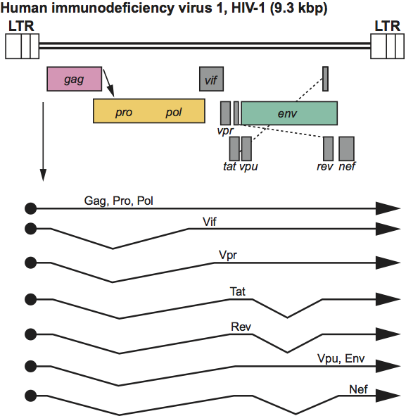 Figure 7 Lentivirus genome expression. The 9.3 kbp human immunodeficiency virus 1 (HIV-1) provirus is shown, with LTRs, protein-coding regions (gagpropolenvvifvprvputatrev and nef) and transcripts (solid line arrows with protein names added) marked. The arrow between the gag-pro reading frames indicates a ribosomal frameshift site. The coding regions in other members of the genus may occupy different reading frames.