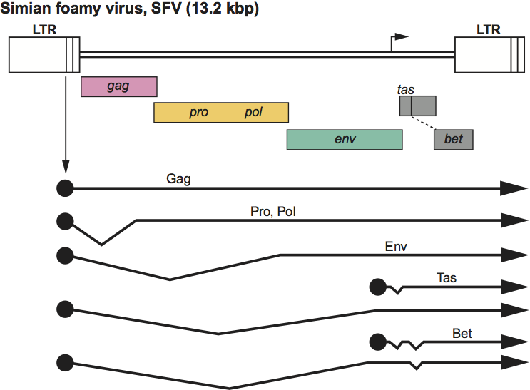 Figure 8 Spumavirus genome expression. The 13.2 kbp simian foamy virus (SFV) provirus is shown, with LTRs, the internal promoter, protein-coding regions (gagpropolenv, tas and bet) and transcripts (solid line arrows with protein names added) marked.