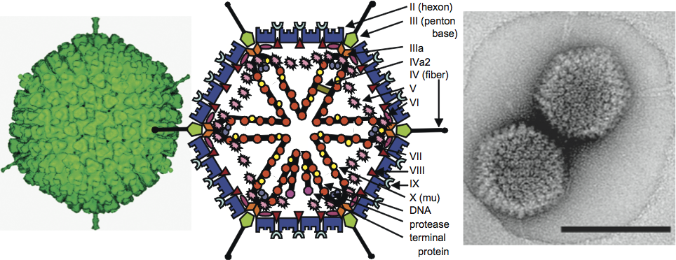 Virions are non-enveloped, 70–90 nm in diameter. The icosahedral capsid consists of 240 non-vertex capsomers (hexons), 8–10 nm in diameter, and 12 vertex capsomers (penton bases), each with a fiber protruding from the virion surface giving the characteristic morphology (Figure 1). Penton base and fiber together make up the penton. The length of fibers examined so far ranges between 9 and 77.5 nm. Human adenoviruses 40 and 41 have fibers of two different lengths that occur alternately on the vertexes. Members of the genus Aviadenovirus have two fiber proteins per vertex. The 240 hexons are formed by the interaction of three identical polypeptides (designated II) and consist of two distinct parts: a triangular top with three “towers”, and a pseudohexagonal base with a central cavity. The hexon bases are tightly packed, forming a protein shell that protects the inner components. In members of the genus Mastadenovirus, 12 copies of polypeptide IX are found between nine hexons in the centre of each facet. Polypeptide IX is not present in the other four genera. Two monomers of IIIa are located underneath the vertex region. Multiple copies of protein VI form a ring underneath the peripentonal hexons. The 12 penton bases are each formed by the interaction of five polypeptides (III) and are tightly associated with one or two (only in aviadenoviruses) fibers, each consisting of three polypeptides (IV) that interact to form a shaft of characteristic length with a distal knob. The 12 pentons (III and IV) are less tightly associated with the neighbouring (peripentonal) hexons. Polypeptide VIII has been assigned to the inner surface of the hexon capsid. Other polypeptides (monomers of IIIa, trimers of IX and multimers of VI) are in contact with hexons, completing a continuous protein shell. Polypeptides VI and VIII appear to link the capsid to the virus core. The core consists of the DNA genome complexed with four polypeptides (V, VII, X, also known as mu or µ, and terminal protein). Protein V is found only in mastadenoviruses.