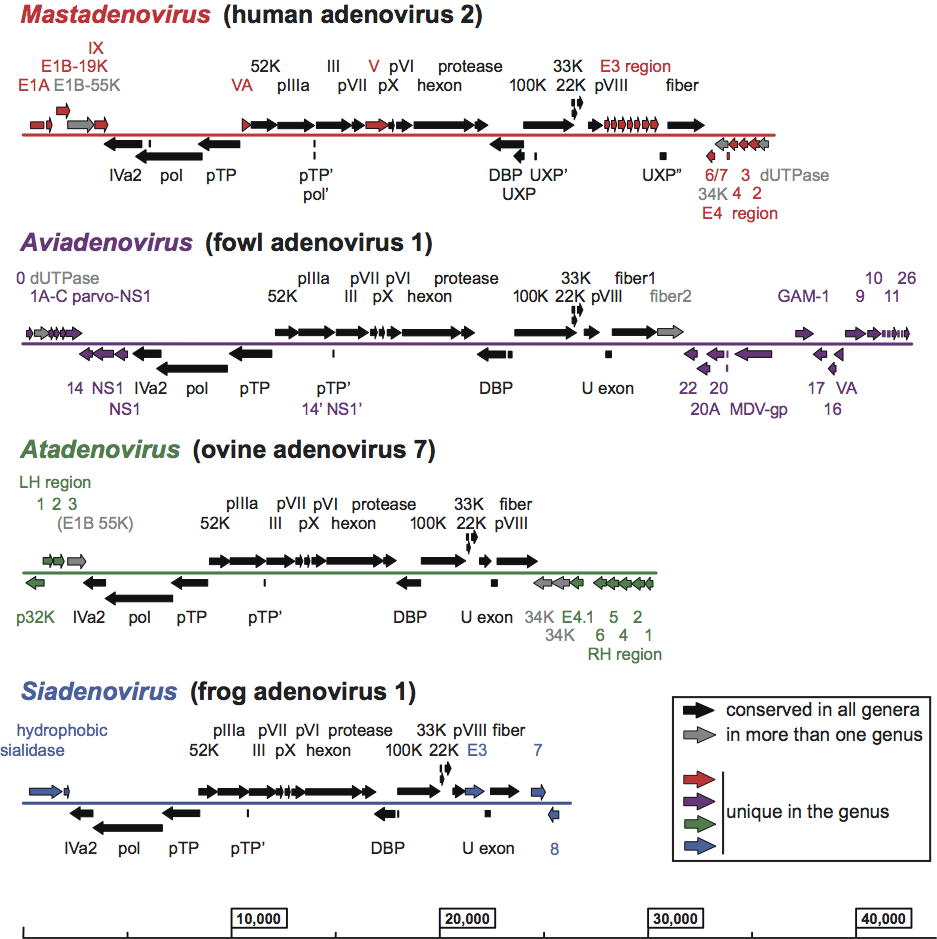 Figure 2 Schematic illustration of the various genome organizations found in members of four adenovirus genera. Black arrows depict genes conserved in every genus, grey arrows show genes present in more than one genus, and coloured arrows show genus-specific genes.
