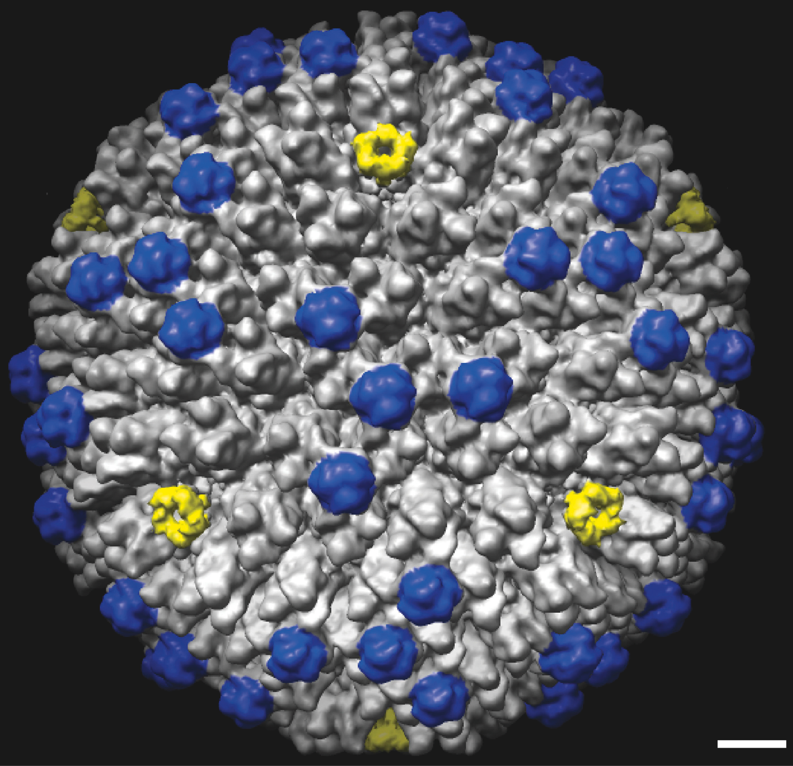Figure 4 Cryo-EM image of ovine atadenovirus 7 at 10.6 resolution. The capsid surface is oriented around one of the three-fold axes. Penton complexes are marked in yellow, indicating the approximate bounds of the icosahedral facet. A major capsid protein (LH3) that is a key distinguishing feature of the virus is marked in blue. The bar represents 10 nm.
