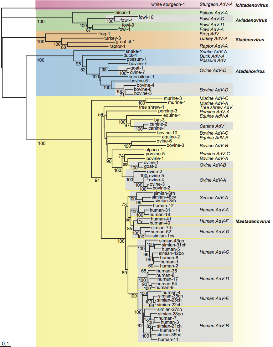 Consistent with specific characteristics of genome organization, phylogenetic calculations result in clear separation of five different clusters corresponding to the five genera (Mastadenovirus, Aviadenovirus, Atadenovirus, Siadenovirus and Ichtadenovirus; Figure 5). Within the genera, evolutionary distances among adenoviruses resemble those of their host. There are some exceptions, where very distantly related viruses infect the same host. Adenovirus types isolated from cattle, sheep or chicken appear on very distant branches, and even in separate clusters corresponding to different genera. Beside the co-evolution that has been hypothesized for animals and their adenoviruses, multiple host switches may also have occurred. For example, adenoviruses from scaled reptiles switched to ruminants and birds.