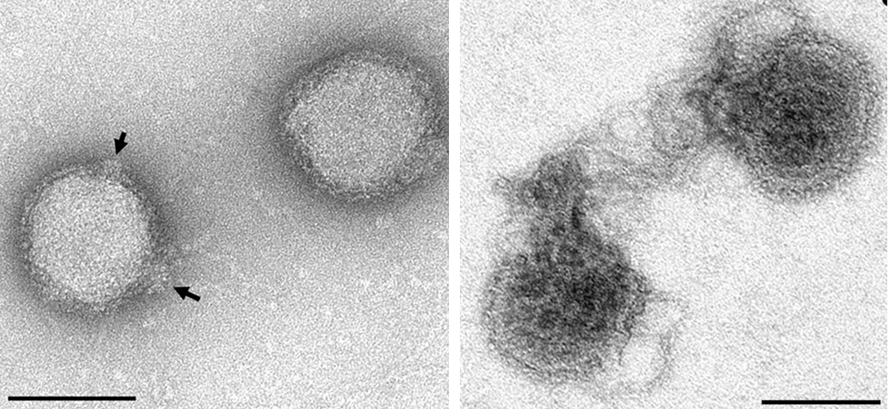 Virions are spherical, 70–100 nm in diameter, with spherical protrusions, about 15 nm in diameter (Figure 1a). Virions carry a lipid-containing envelope. It encases a superhelical core, consisting of linear dsDNA and nucleoproteins (Figure 1b).