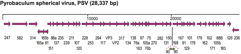 Figure 2 Genome organization of Pyrobaculum spherical virus showing location, sizes and direction of putative genes. VP2 and VP3 encode the minor and major structural proteins of the virion respectively.
