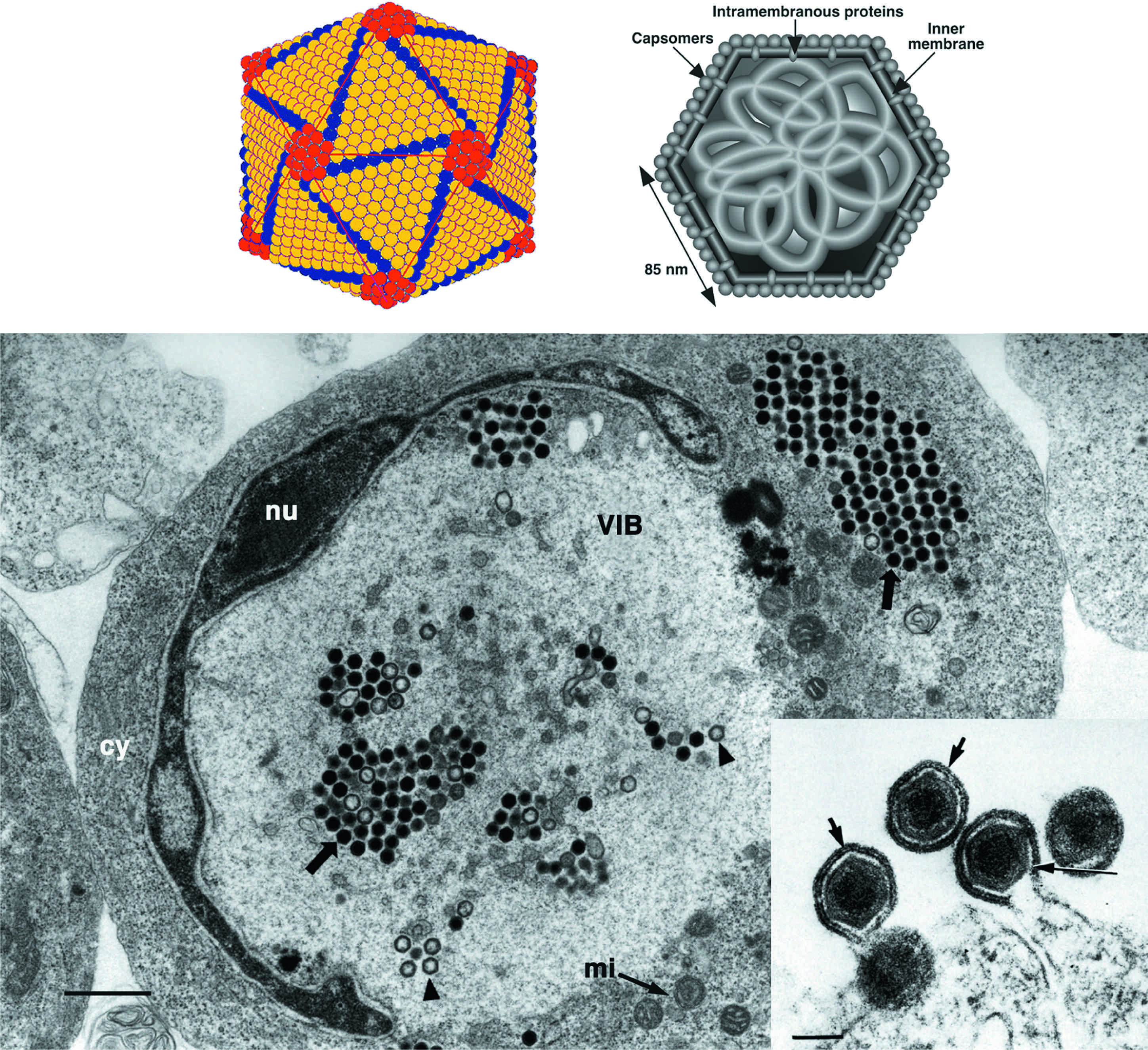 Figure 1 (Top left) Outer shell of invertebrate iridescent virus 2 (IIV-2) (from Wrigley et al. (1969). J. Gen. Virol., 5, 123; with permission). (Top right) Schematic diagram of a cross-section of an iridovirus particle, showing capsomers, transmembrane proteins within the lipid bilayer, and an internal filamentous nucleoprotein core (from Darcy-Tripier et al. (1984). Virology, 138, 287; with permission). (Bottom left) Transmission electron micrograph of a fat head minnow cell infected with an isolate of European catfish virus. Nucleus (nu); virus inclusion body (VIB); paracrystalline array of non-enveloped virus particles (arrows); incomplete nucleocapsids (arrowheads); cytoplasm (cy); mitochondrion (mi); the bar represents 1 m (from Hyatt et al. (2000). Arch. Virol., 145, 301; with permission). (insert) Transmission electron micrograph of particles of frog virus 3 (FV-3), budding from the plasma membrane. Arrows and arrowheads identify the viral envelope; the bar represents 200 nm