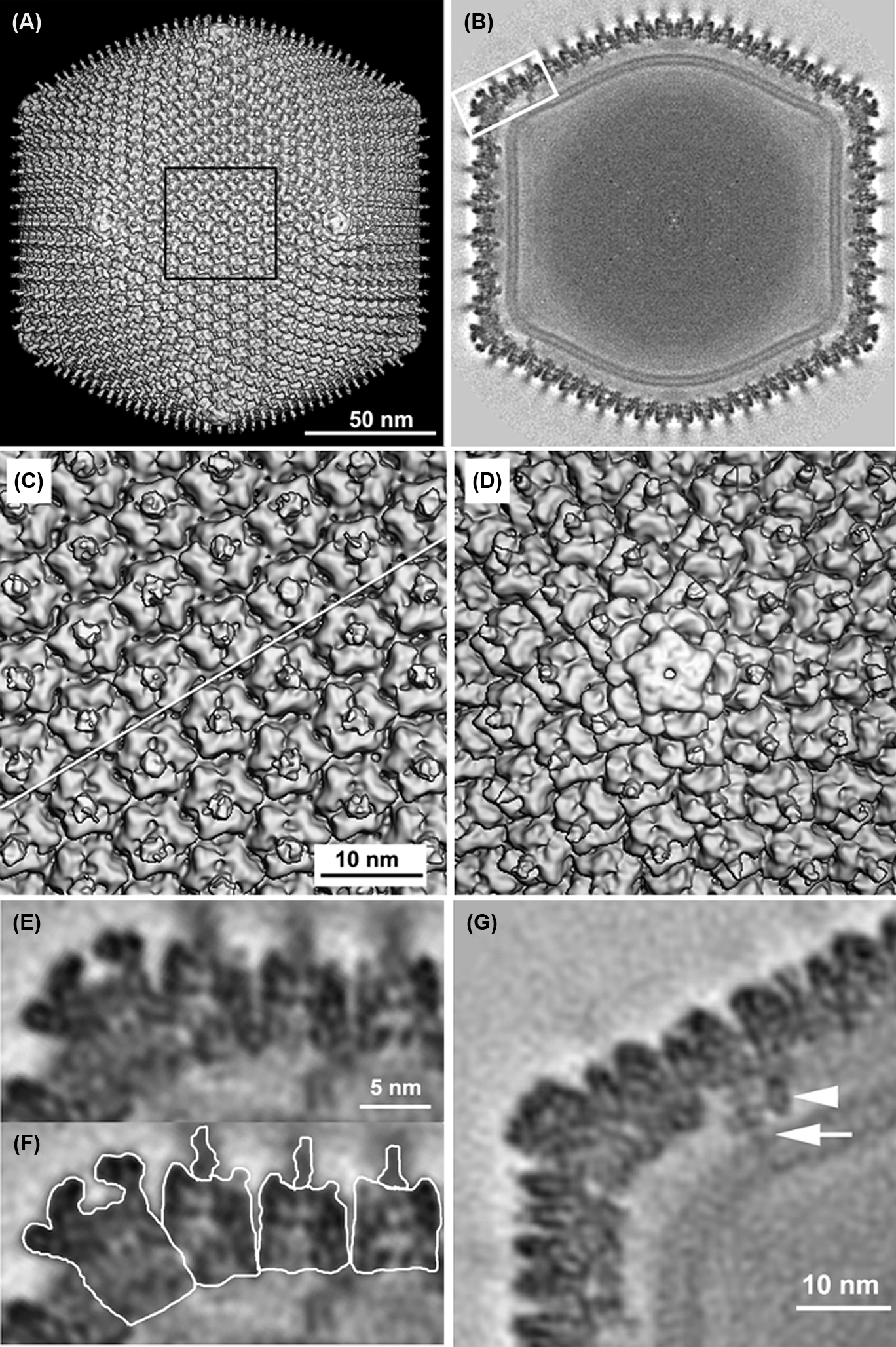 Figure 2 Three-dimensional reconstruction of an IIV-6 particle at a resolution of 1.3 nm. (A) 3-D density map of particle viewed along an icosahedral two-fold axis. The external fringe of filaments has been blurred away due to their varying position in relation to the symmetry of the capsid. (B) Central cross-section, one pixel thick. A lipid bilayer follows the inner contour and icosahedral symmetry of the capsid shell whereas the core appears to lack any structures that are arranged following icosahedral symmetry. (C) Magnified view of the central region outlined in (A). The diagonal white line indicates the cleavage plane between adjacent trisymmetrons. (D) Magnified view of the propeller-like pentamer complex at the five-fold vertex. This complex differs from the trimeric capsomers in that it is larger, has a small axial hole, and lacks an external fibre. (E) Magnified view of boxed region in (B) showing transverse section of the pentamer complex and adjacent trisymmetrons. (F) Same as (E) but with the pentamer complex, three capsomers, and their fibres individually outlined. (G) Transmembrane anchor proteins beneath the pentasymmetrons showing two sticklike entities. The longer of the two (long arrow) crosses both leaflets of the bilayer, whereas the other (short arrow) stops at the outer leaflet of the internal lipid membrane.