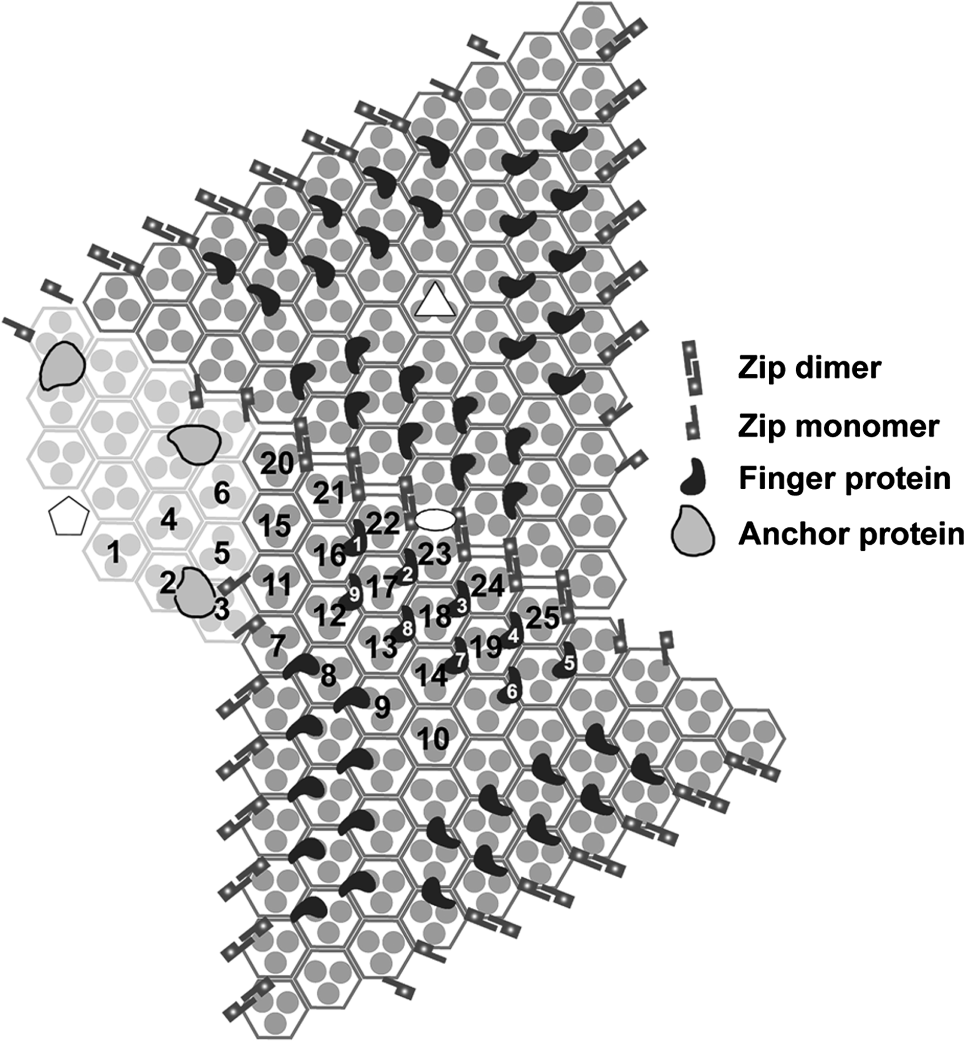 Figure 3 Schematic planar diagram of the IIV-6 capsid structure with the central pentamer complex (white pentagon) omitted for clarity. The centrally located white ellipse, triangle and pentagon symbols highlight the positions of 2-, 3-, and 5-fold icosahedral axes, respectively. All major capsid protein trimers are shown as three small grey disks enclosed by a hexagon. The icosahedral asymmetric unit contains 24 and one-third of these capsomers (numbered 125). Each trisymmetron contains 55 capsomers, all oriented similarly and rotated by 60 relative to those in the adjacent trisymmetron. Finger proteins bind to each trisymmetron (nine within one asymmetric unit are numbered in white), a total of 27 in each trisymmetron. A total of 18 Zip dimers are present at the interface between one trisymmetron and its adjacent trisymmetrons. Zip monomers are located at the interface between a trisymmetron and its neighbouring pentasymmetrons. The transmembrane anchor proteins (shown in Figure 2G) are located under capsomers 2 and 3 beneath the pentasymmetron.
