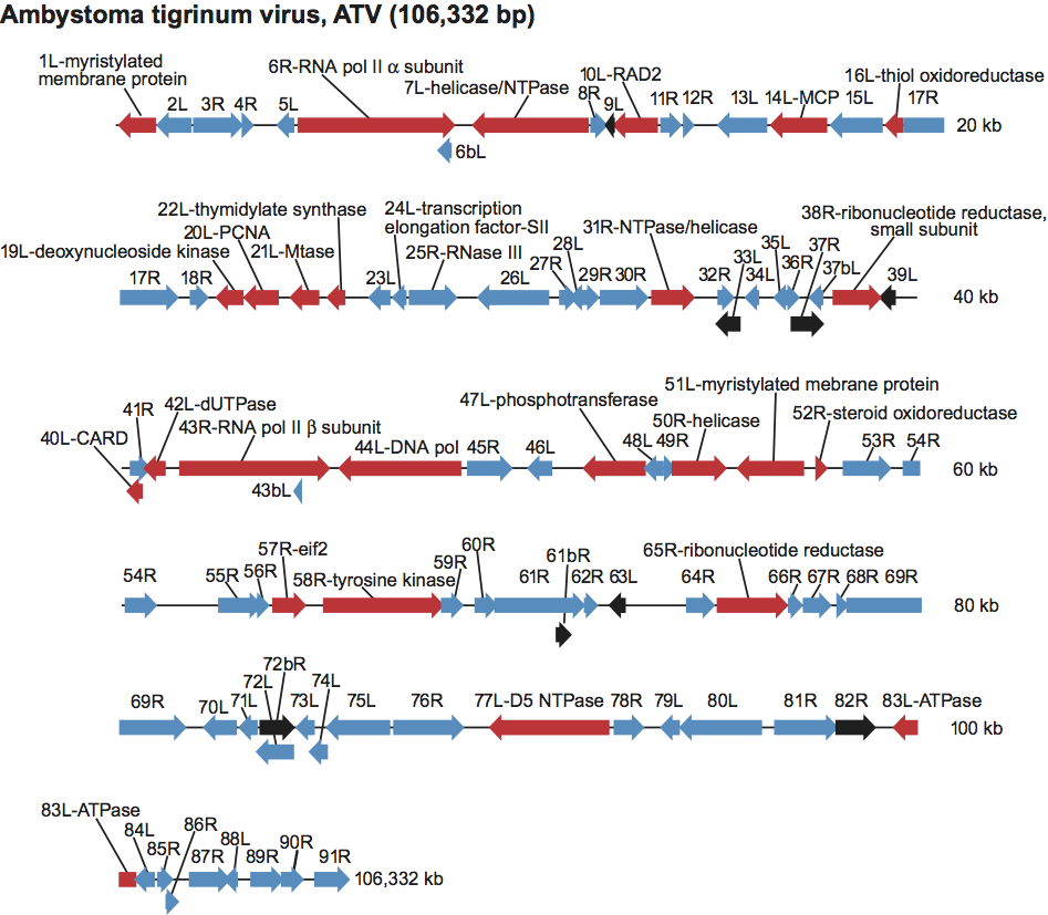 Figure 4 Genomic structure of Ambystoma tigrinum virus (ATV). Arrows represent viral ORFs with their size, position and orientation shown. ORFs of known function are colored in red and their putative proteins identified; ORFs with known homology to tiger frog virus (TFV) are in blue; and those of unknown function or with no homology to TFV are indicated in black.