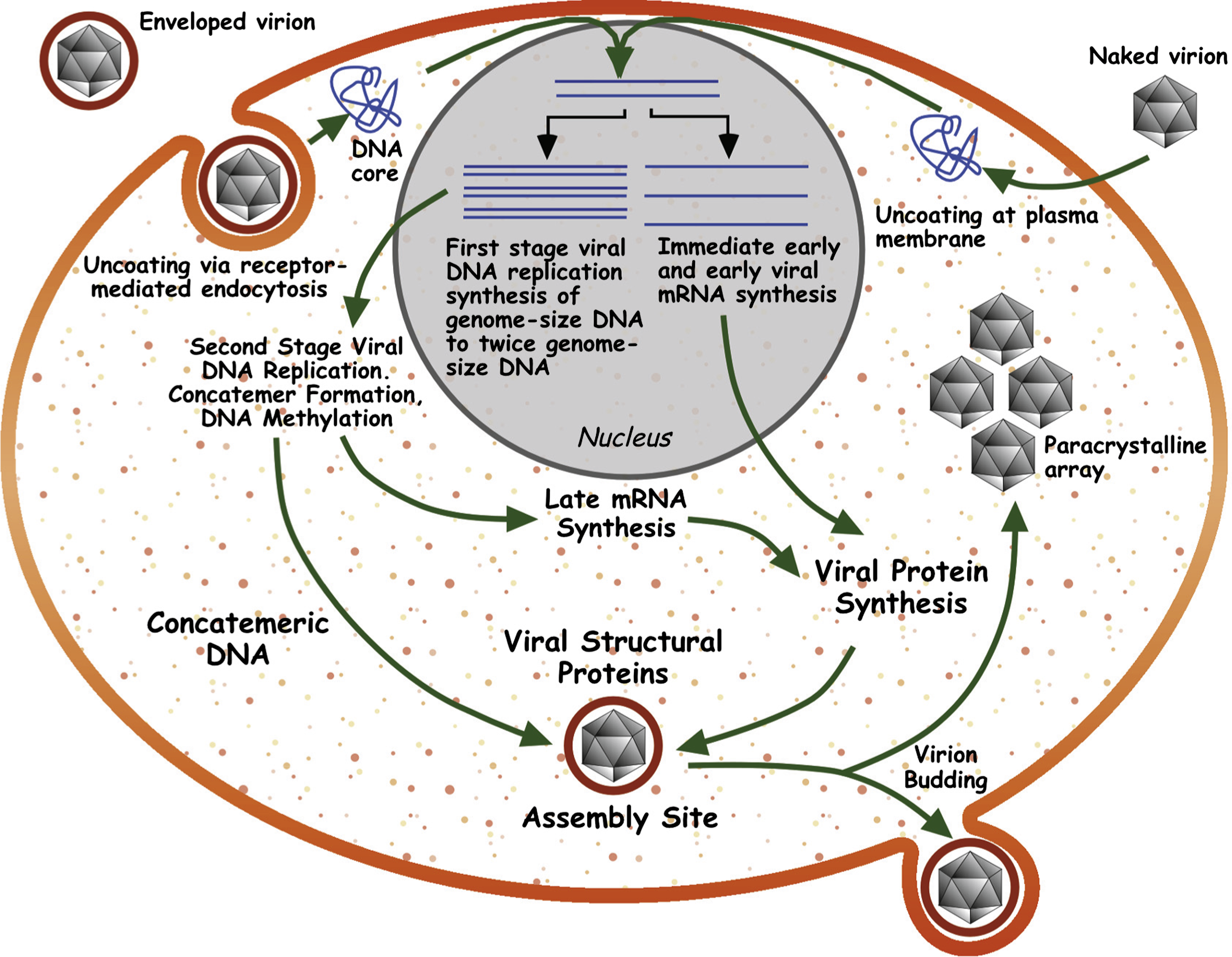 The replication strategy of iridoviruses is novel and has been elucidated primarily through the study of FV-3, the type species of the genus Ranavirus (Figure 5). Virion entry occurs by either receptor-mediated endocytosis (enveloped particles) or by uncoating at the plasma membrane (naked virions). Following uncoating, viral cores enter the nucleus where first stage DNA synthesis and the synthesis of immediate early (IE) and delayed early (DE) viral transcripts takes place. In a poorly understood process, one or more virion associated proteins act as transactivators and re-direct host RNA polymerase II to synthesize IE and DE viral mRNAs using the methylated viral genome as template. Gene products encoded by IE and DE viral transcripts include both regulatory and catalytic proteins. One of these gene products, the viral DNA polymerase, catalyzes the first stage of viral DNA synthesis. In this process, the parental viral genome serves as the template and progeny DNA that is genome-length, to at most twice genome length, is produced. Newly-synthesized viral DNA may serve as the template for additional rounds of DNA replication or early transcription, or it may be transported to the cytoplasm where the second stage of viral DNA synthesis occurs. In the cytoplasm, viral DNA is synthesized into large, branched concatamers that serve as the template for DNA packaging.