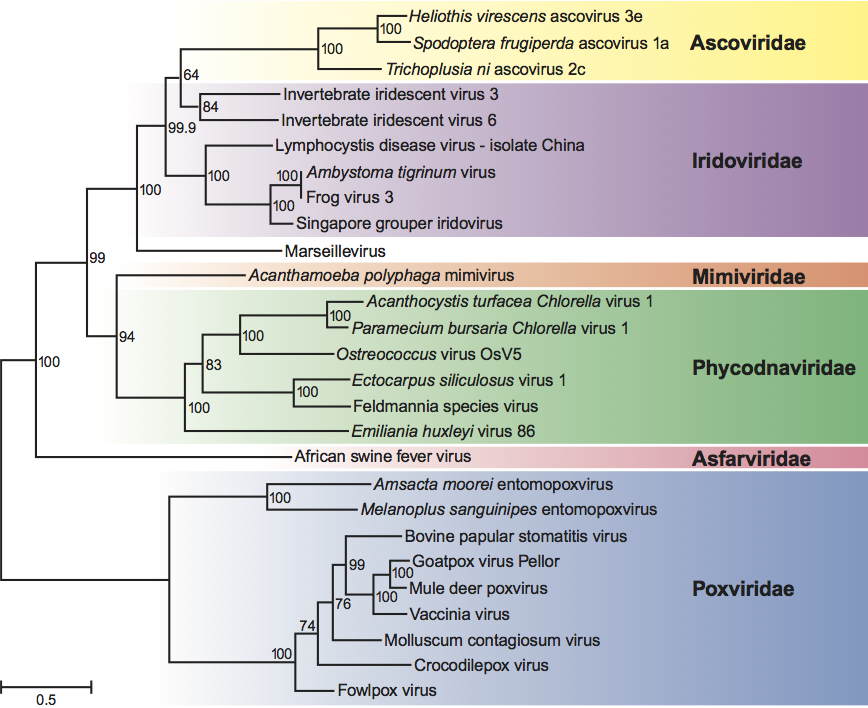 The iridovirus D5 ATPase, A32 ATPase, A1L/VLTF2 transcription factor, MCP and viral DNA polymerase B genes share aa sequence similarities to other nucleocytoplasmic large DNA viruses (NCLDV) such as African swine fever virus (Asfarviridae), species within the family Ascoviridae, Paramecium bursaria Chlorella virus 1 (Phycodnaviridae), Marseillevirus (Mimivirus), and poxviruses (Poxviridae) (Figure 7). Although not shown here, more distant relatedness to other NCLDV species including herpesviruses, adenoviruses and baculoviruses has also been noted.