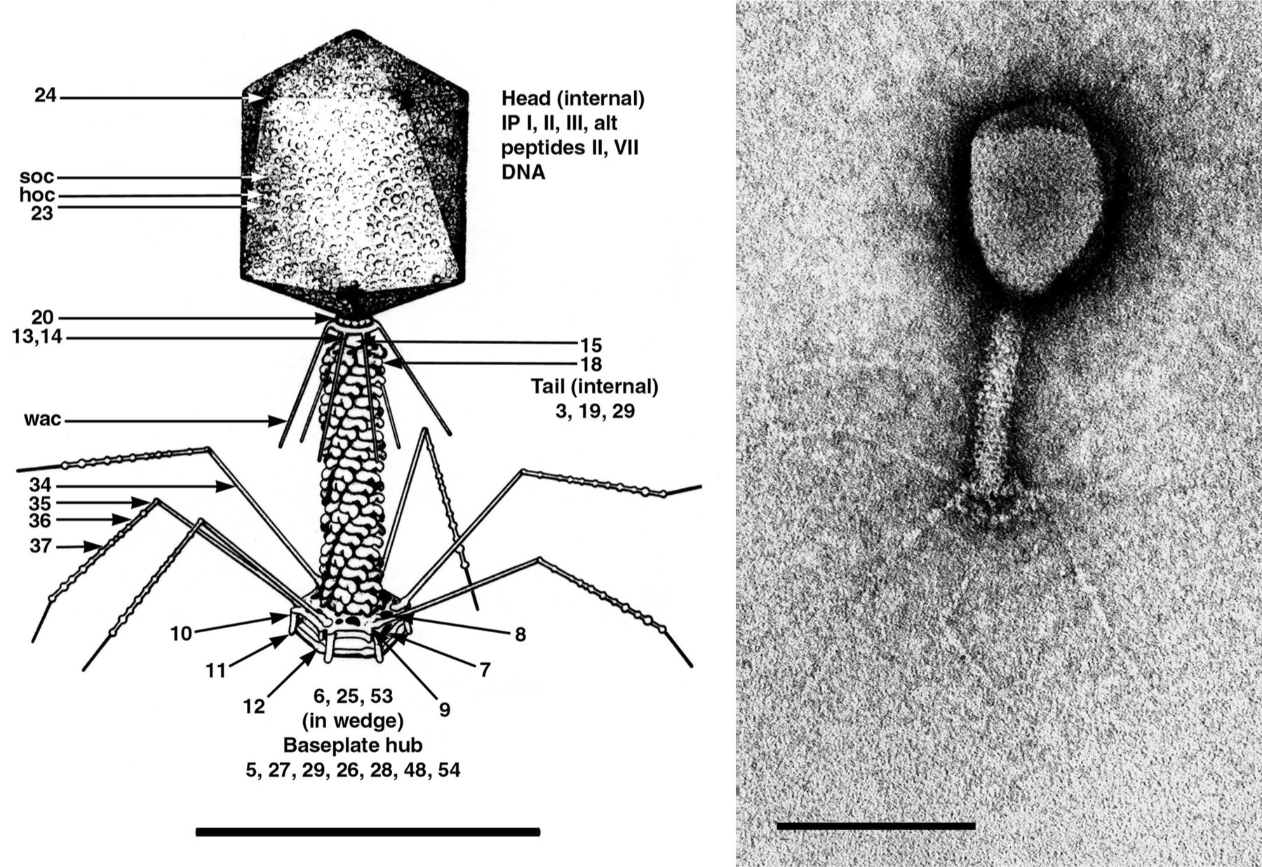 Figure 1 (Left) Diagram of Enterobacteria phage T4 (T4) showing detailed location of structural proteins. Head vertices consist of cleaved gp24. Gp20 is located at the headtail connector. Collar and whiskers appear to be made of the same protein, gpwac. Sheath subunits (gp18) fit into holes in the base plate and short tail proteins (gp12) are shown in the quiescent state. The complex base is assembled from a central plug and six wedges. Tail fibers consist of three proteins. (Right) Negative contrast electron micrograph of T4 particle stained with uranyl acetate. The bars represent 100 nm.