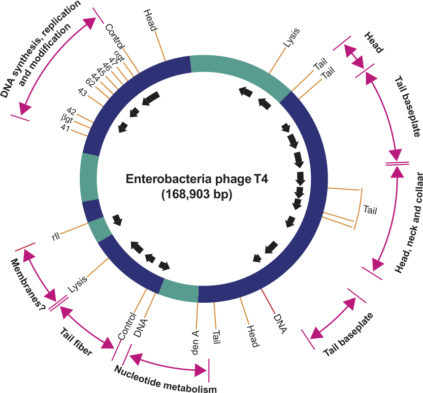 Miller, E., Kutter, E., Mosig, G., Arisaka, F., Kunisawa, T. and Rüger, W. (2003). Bacteriophage T4. Microbiol. Molec. Biol. Rev.I 67, 86-156.