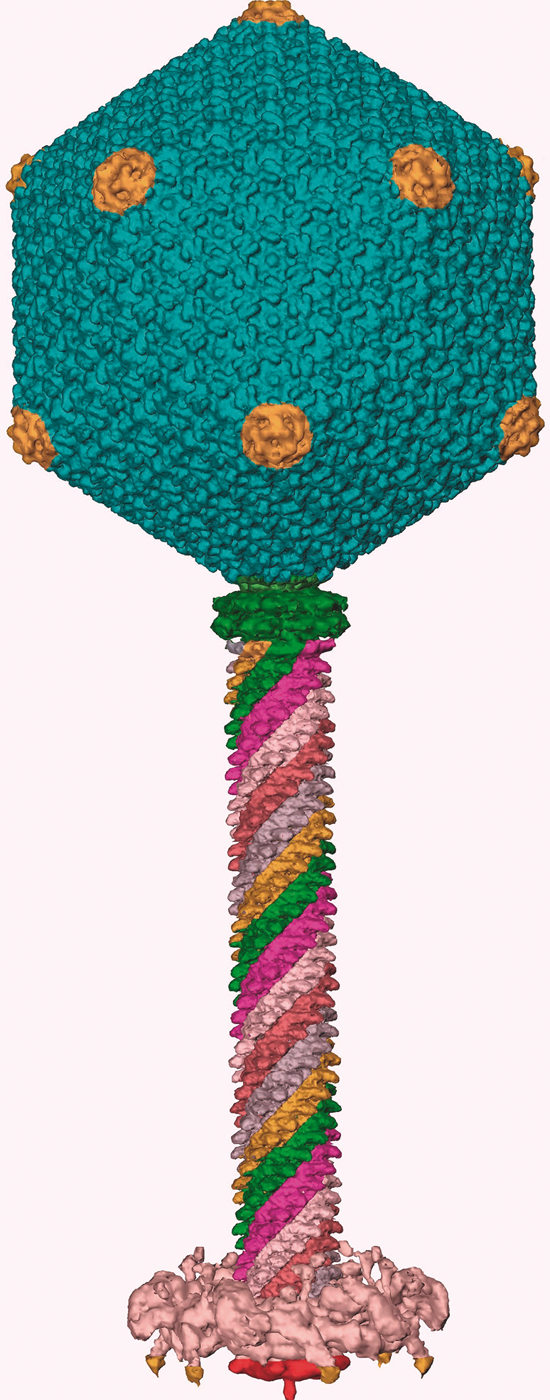 Figure 3 Cryo-EM-based reconstruction of bacteriophage KZ. Spiralling tail sheath vertices are highlighted.