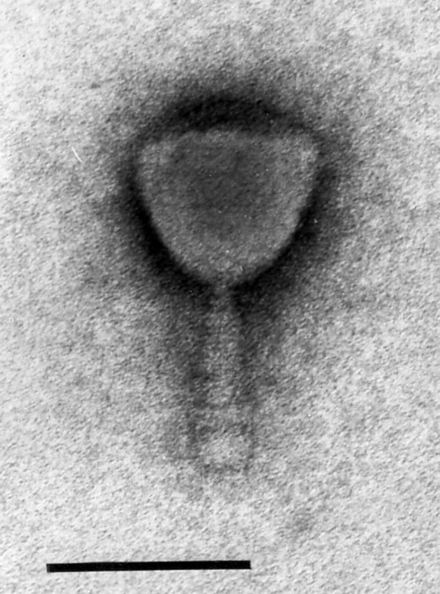 Figure 4 Electron micrographs of Mycobacterium phage I3. Phage particles were positively stained with uranyl acetate. The bar represents 100 nm.