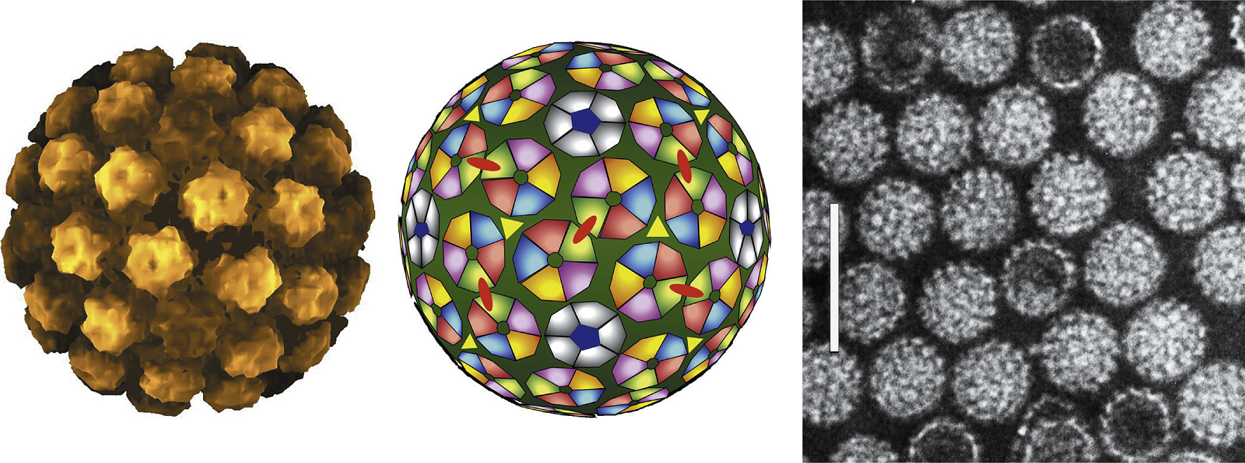 Figure 1 (Left) Atomic rendering of a papillomavirus capsid. Derived from an image reconstruction from electron cryomicroscopy of bovine papillomavirus (BPV) at 9 resolution combined with coordinates from the crystal structure of small virus-like particles of the human papillomavirus 16 (HPV-16) L1 protein (from Modis et al. (2002). EMBO J., 21, 47544762). (Centre) Schematic diagram representing the 72 capsomers in a T=7 arrangement of a papillomavirus capsid. The icosahedral structure includes 360 VP1 subunits arranged in 12 pentavalent and 60 hexavalent capsomers. (Right) Negative contrast electron micrograph of human papillomavirus 1 (HPV-1) virions. The bar represents 100 nm.
