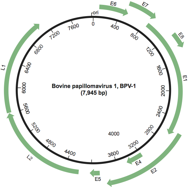 Figure 2 Diagram of the bovine papillomavirus 1 (BPV-1) genome. The viral dsDNA (size in bp, origin of replication: ori) is indicated. The outer arrows indicate the protein-coding ORFs and their direction of transcription.