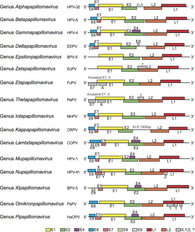 Figure 3 Comparison of genome organization for the viruses corresponding to the type species of each genus in the family Papillomaviridae. The circular dsDNA genomes have been linearized, with ori as the opening site (see Figure 2). Similar ORFs are indicated in similar colors. For abbreviations, see species lists in text.