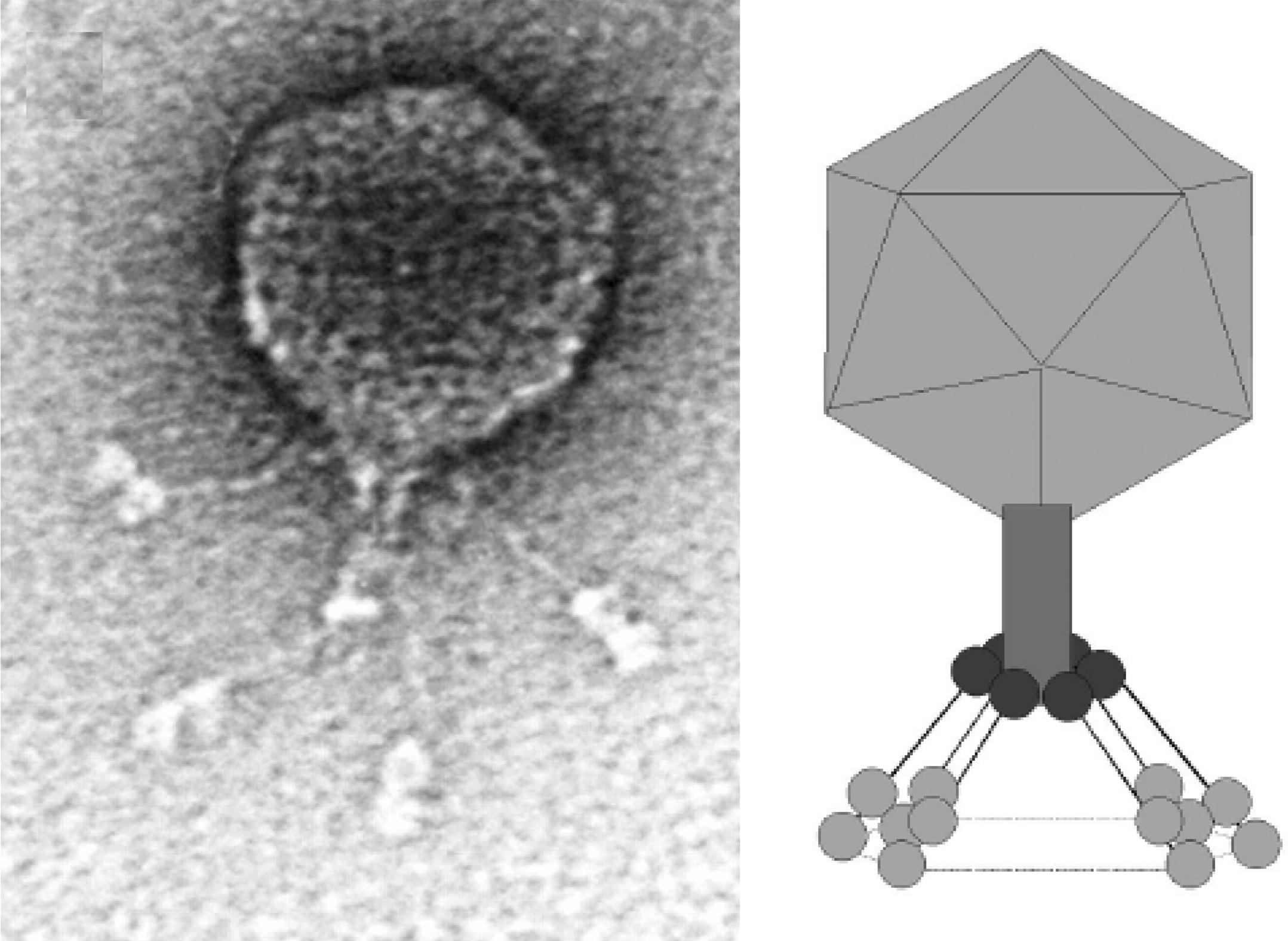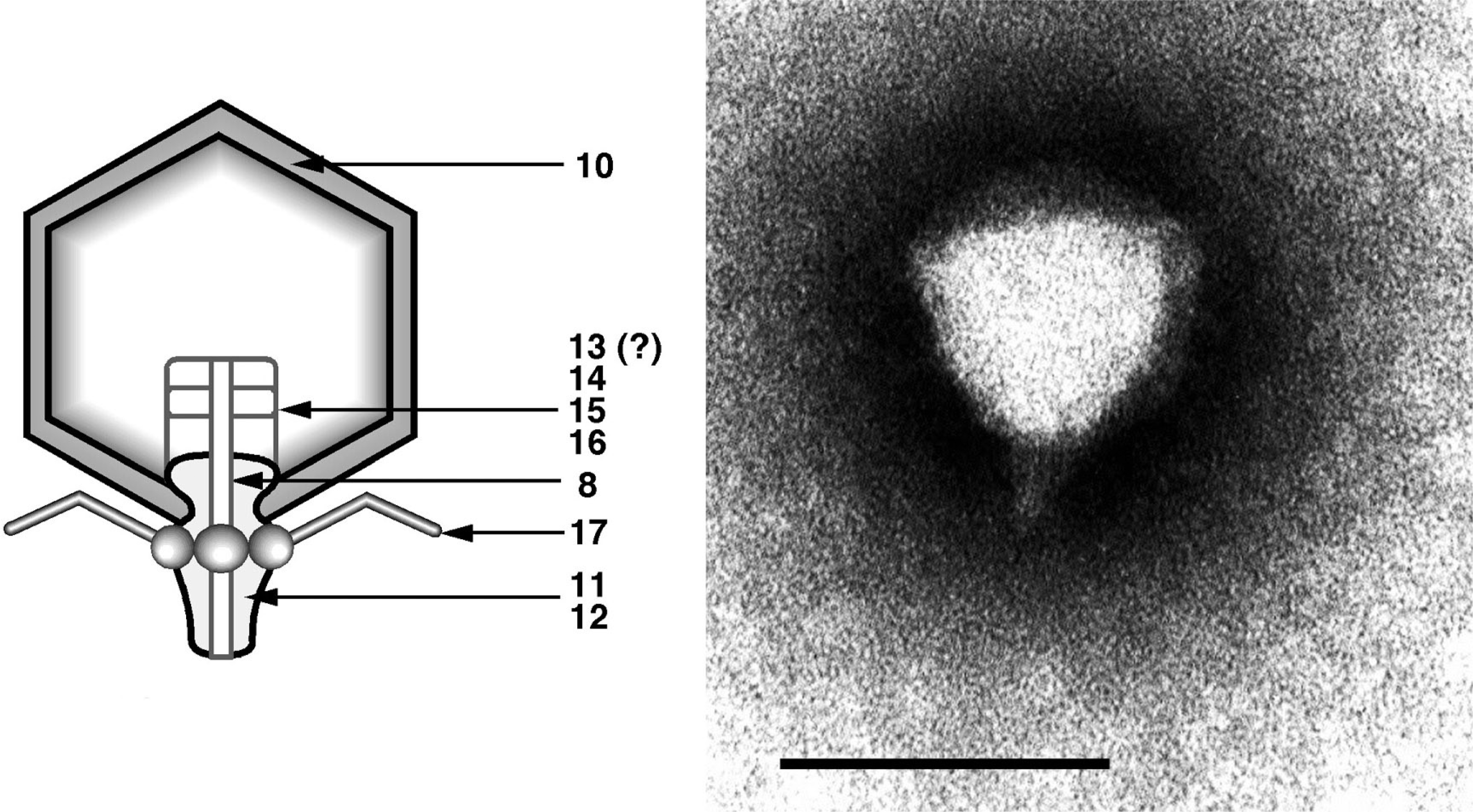 Figure 7 (Left) Diagram of particle of Enterobacteria phage T7 (T7) in section. The bar represents 50 nm. (Right) Negative contrast electron micrograph of a particle of phage T7, stained with phosphotungstate. The bar represents 100 nm.