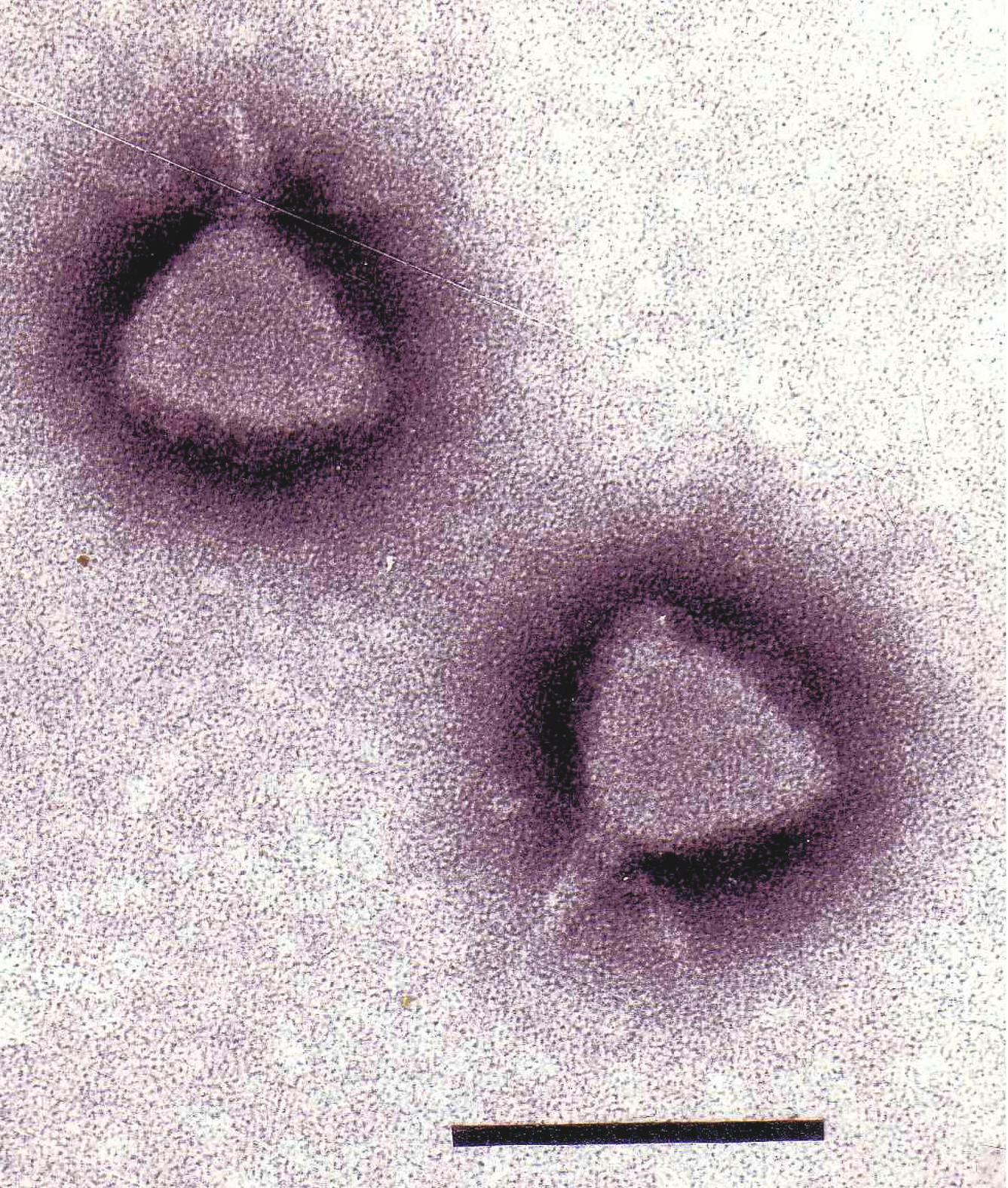 Figure 5 Phage P22 stained with uranyl acetate. The bar represents 100 nm bar.