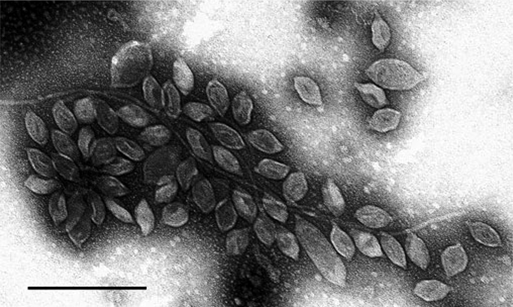 Morphologically, virus capsids resemble spindle-shaped archaeal viruses of Sulfolobus (SSV1) but on all other available criteria – sequence similarity, genome structure and replication – they appear to be very different.