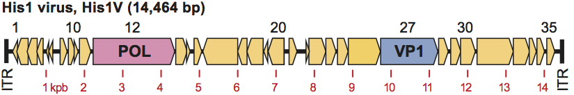 Figure 2 His1 genome, showing predicted ORFs (numbers above), inverted terminal repeats (ITR), the DNA polymerase (POL) and probable major capsid protein gene (VP1). Scale shown underneath is in kbp.