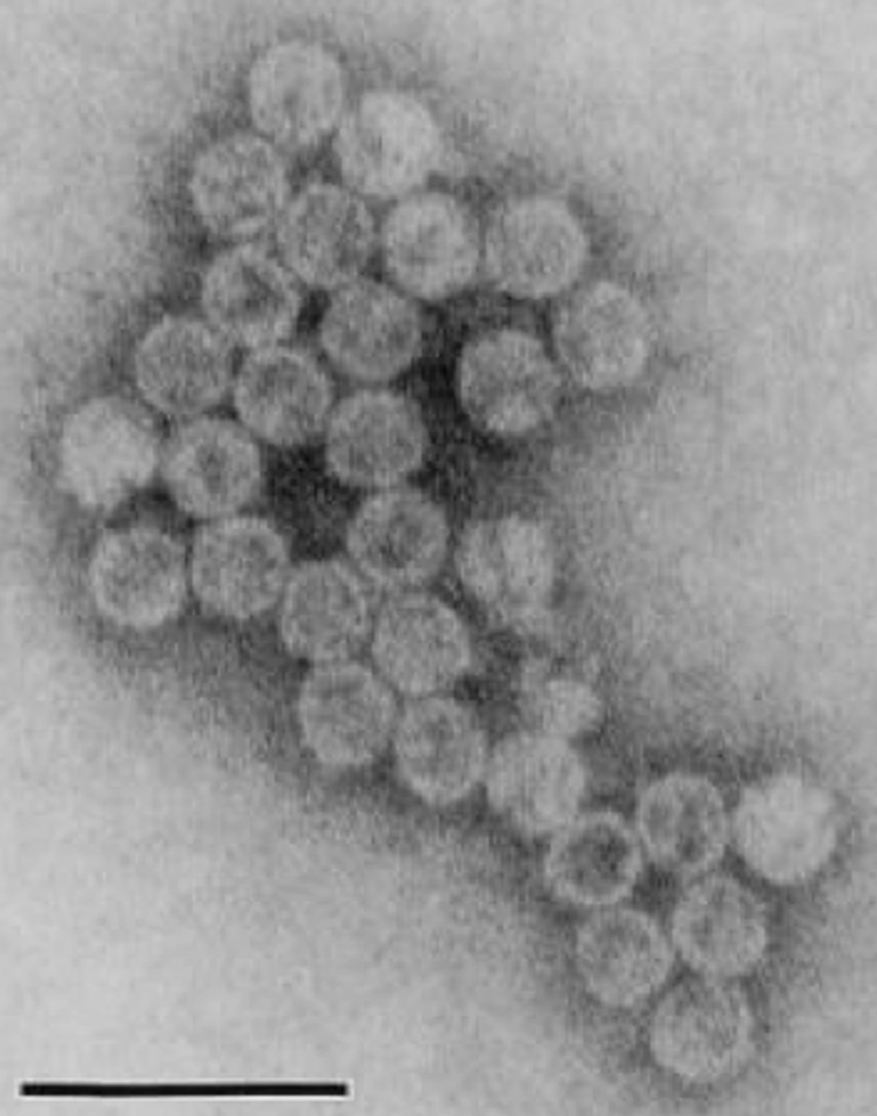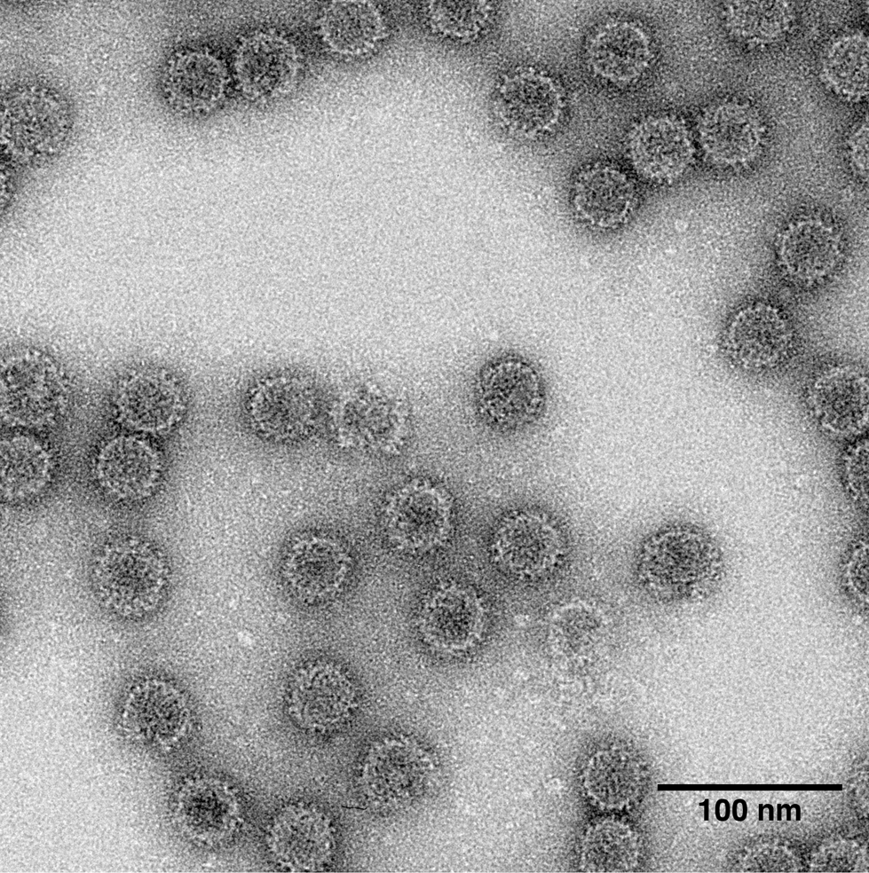 Virions are isometric and nonenveloped, about 31 nm in diameter as visualized by negative staining and transmission electron microscopy (Figure 7). The capsids appear single layered and thin, with short protrusions on their surfaces.