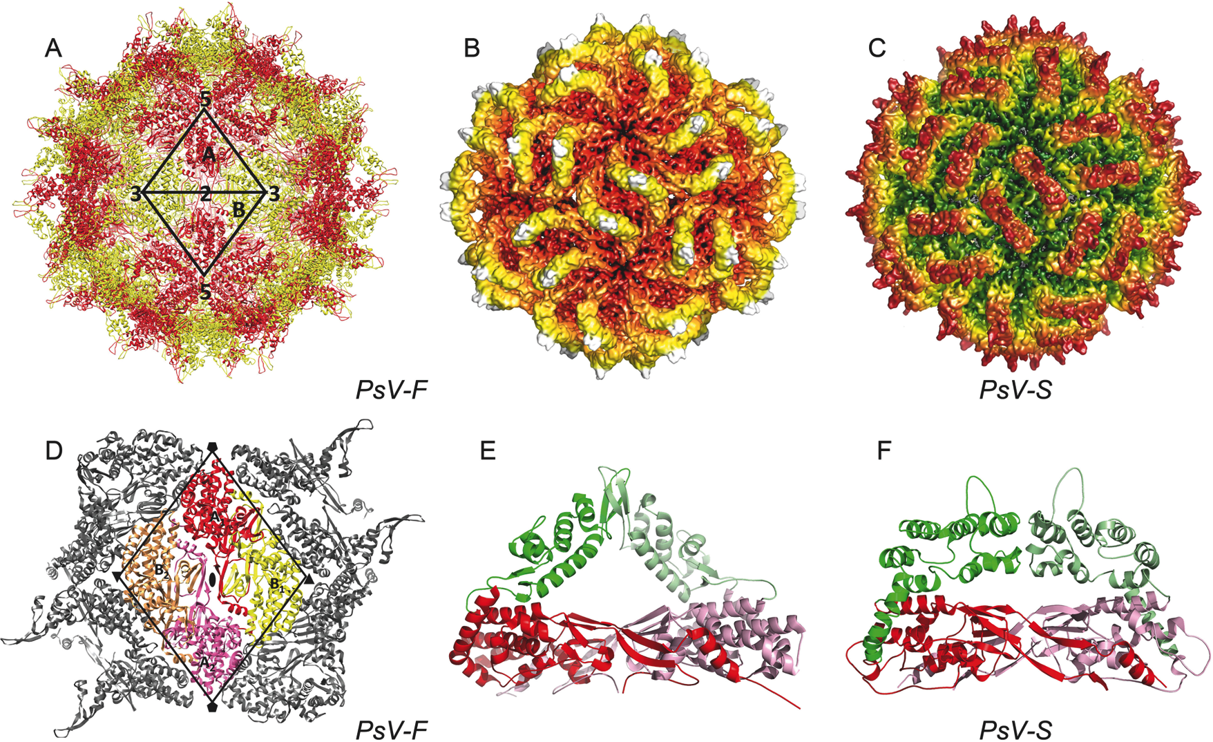 Figure 2 Structures of two partitiviruses. (A) Crystal structure of an isolate of Penicillium stoloniferum virus F. Two asymmetric units of the icosahedron are highlighted along with the icosahedral symmetry elements that define the boundaries of these units. One CPA monomer (in red) and one CPB monomer (in yellow) from the same CP dimer are labelled. (B-C) Cryo-EM reconstructions of PsV-F and -S, both at ~4.5 resolution, and rendered with radial, color mapping. (D) Putative capsid assembly unit consists of a dimer of CP dimers (redyellow, labelled A1-B1 and pinkorange, labelled A2-B2) that occupy a diamond-shaped area defined by black lines. (E) A PsV-F CP dimer. In this and the next panel (F), the arch and shell domains are highlighted green/light green and red/magenta, respectively, and the two subunits are distinguished as green or light green and red or magenta. (F) A PsV-S CP dimer. The atomic coordinates for this model were generated from a homology model derived from the PsV-F structure and constrained by its fit to the PsV-S cryo-EM reconstruction.