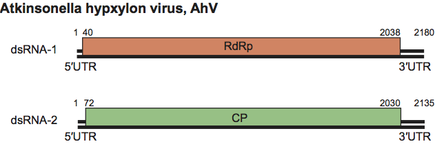 Figure 3 Genome organization of Atkinsonella hypxylon virus (AhV). The RdRp ORF (nt positions 40-2038 on dsRNA1) and the CP ORF (nt positions 72-2030 on dsRNA2) are represented by rectangular boxes.