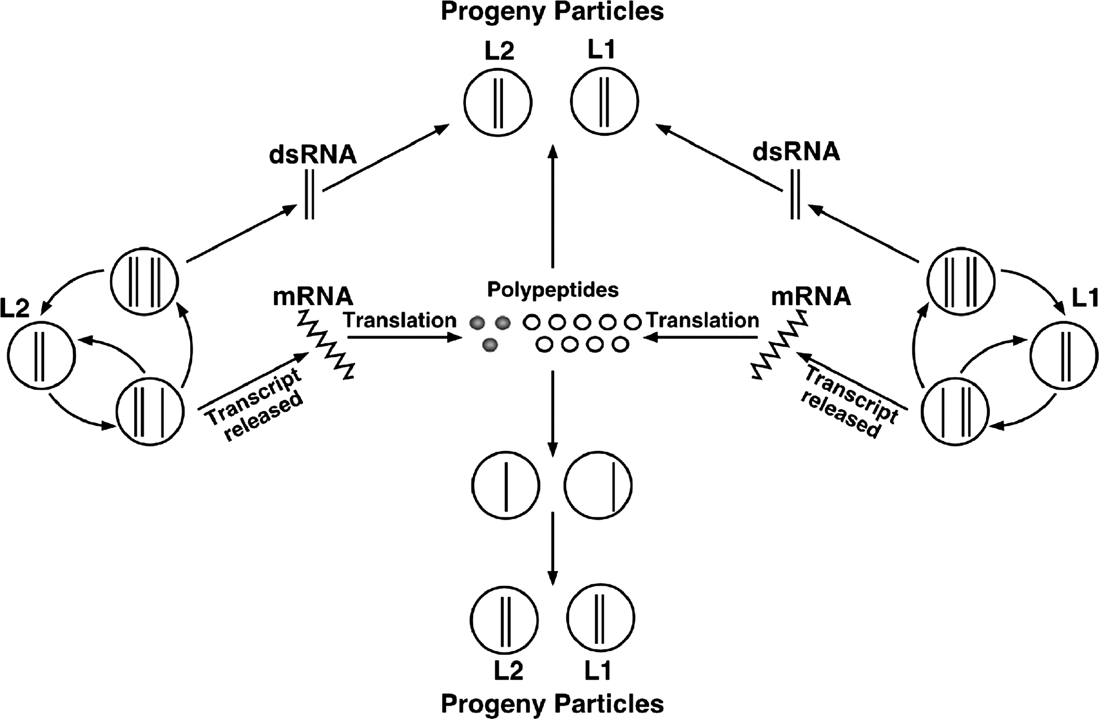 Figure 4 Model for replication of Penicillium stoloniferum virus S (PsV-S). The open circles represent CP subunits and the closed circles represent RNA polymerase subunits. Solid lines represent RNA strands whereas wavy lines represent mRNA.