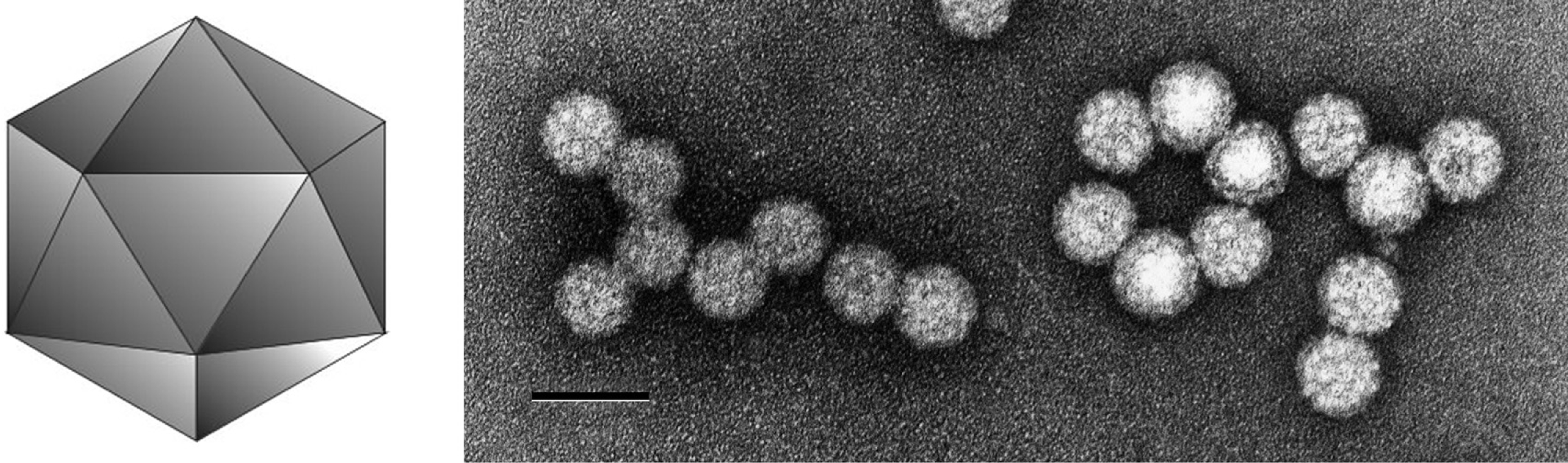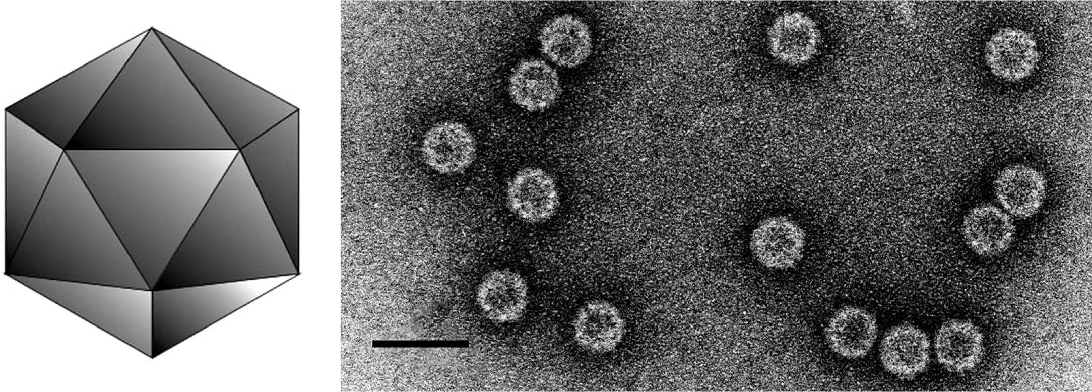 Figure 5 (Left) Diagrammatic representation of an alphacryptovirus capsid. (Right) Negative contrast electron micrograph of particles of an isolate of White clover cryptic virus 1, the type species of the genus Alphacryptovirus. The bar represents 50 nm.