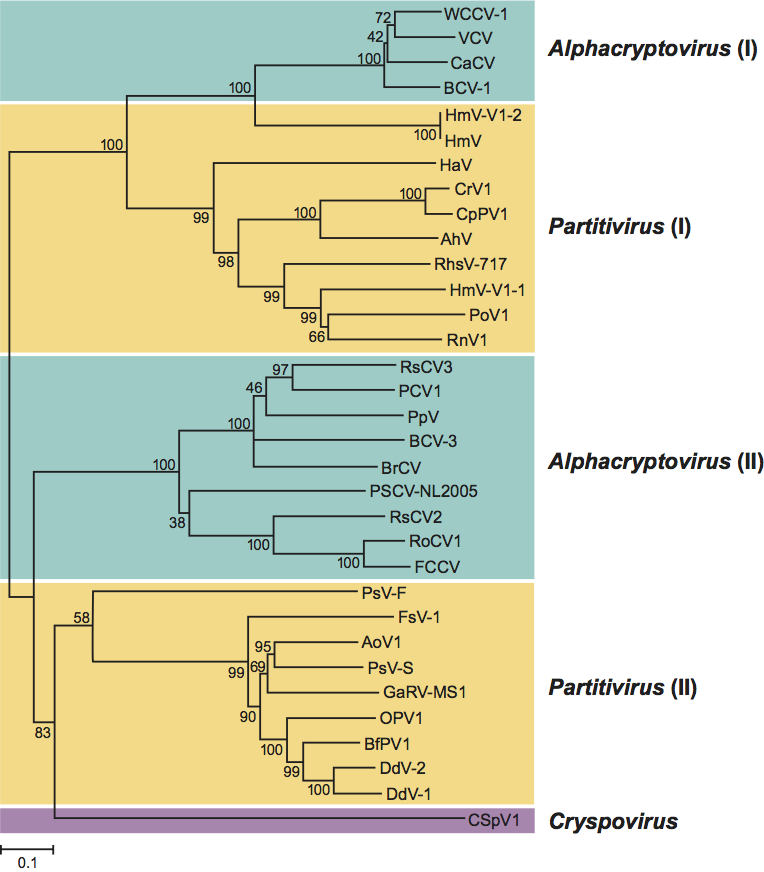 Figure 8 Neighbor-joining phylogenetic tree constructed based on the complete amino acid sequences of RdRps of members and probable members of the family Partitiviridae. The amino acid sequences were aligned using the program CLUSTAL W. For virus names and abbreviations, see lists in text. The phylogenetic tree was generated including codon positions using the MEGA4 phylogenetic package. Bootstrap percentages out of 1000 replicates are indicated at the nodes.