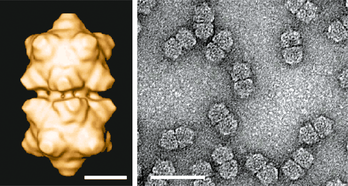 Figure 1 (Left) Cryo-electron microscopic reconstruction of maize streak virus (MSV) viewed along a twofold axis of symmetry. The bar represents 10 nm. (Right) Purified particles of MSV stained with uranyl acetate showing typical twinned quasi-isometric subunits. The bar represents 50 nm.