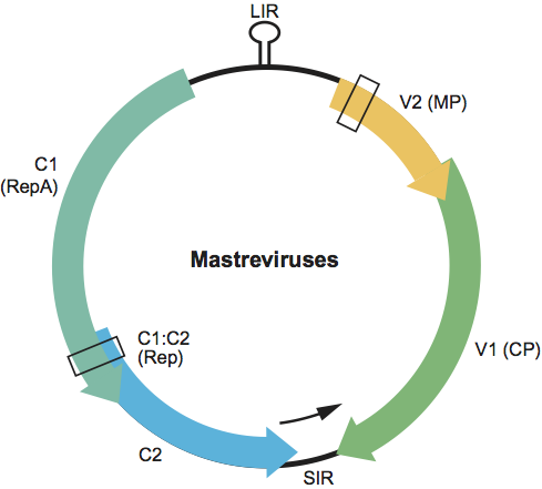 Figure 2 Typical genomic organization of mastreviruses. ORFs are denoted as either being encoded on the virion-sense (V) or complementary-sense (C) strand, and corresponding genes are indicated. The positions of the stem-loop motif containing the conserved TAATATTAC sequence in the large intergenic region (LIR) and the encapsidated complementary-sense primer-like molecule (small arrow) in the small intergenic region (SIR) are shown. Introns (open boxes) occur in ORF V2 and at the overlap between ORFs C1 and C2. MP; movement protein, CP; coat protein, REP; replication-associated protein.