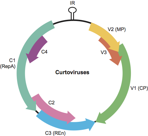 Figure 3 Typical genomic organization of curtoviruses. ORFs are denoted as either being encoded on the virion-sense (V) or complementary-sense (C) strand. Gene designations are shown where these are known. ORF C3 is not present in horseradish curly top virus (HrCTV). The position of the stem-loop containing the conserved TAATATTAC sequence located in the intergenic region (IR) is shown. CP; coat protein, MP; movement protein, Rep; replication-associated protein, REn; replication enhancer.