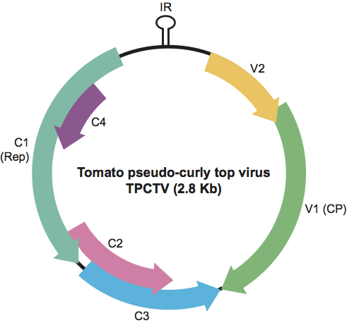 Figure 4 Genomic organization of TPCTV. ORFs are denoted as either being encoded on the virion-sense (V) or complementary-sense (C) strand. Gene designations are shown where these are known. The position of the stem-loop containing the conserved TAATATTAC sequence, located within the intergenic region, is shown. CP, coat protein; Rep, replication-associated protein.