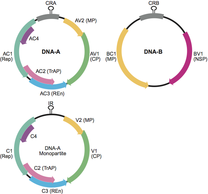 Figure 5 Genomic organization of begomoviruses. ORFs are denoted as either being encoded on the virion-sense (V) or complementary-sense (C) strand, preceded by component designation (A or B) if bipartite (top). The common region (CRA and CRB; top), representing largely intergenic sequences that are shared between the two genomic components of bipartite viruses are shown as grey boxes. The position of the stem-loop containing the conserved TAATATTAC sequence, located within the intergenic regions (CRA and CRB, top; IR, bottom) is shown. CP, coat protein; Rep, replication-associated protein; TrAP, transcriptional activator protein; REn, replication enhancer; MP, movement protein; NSP, nuclear shuttle protein.