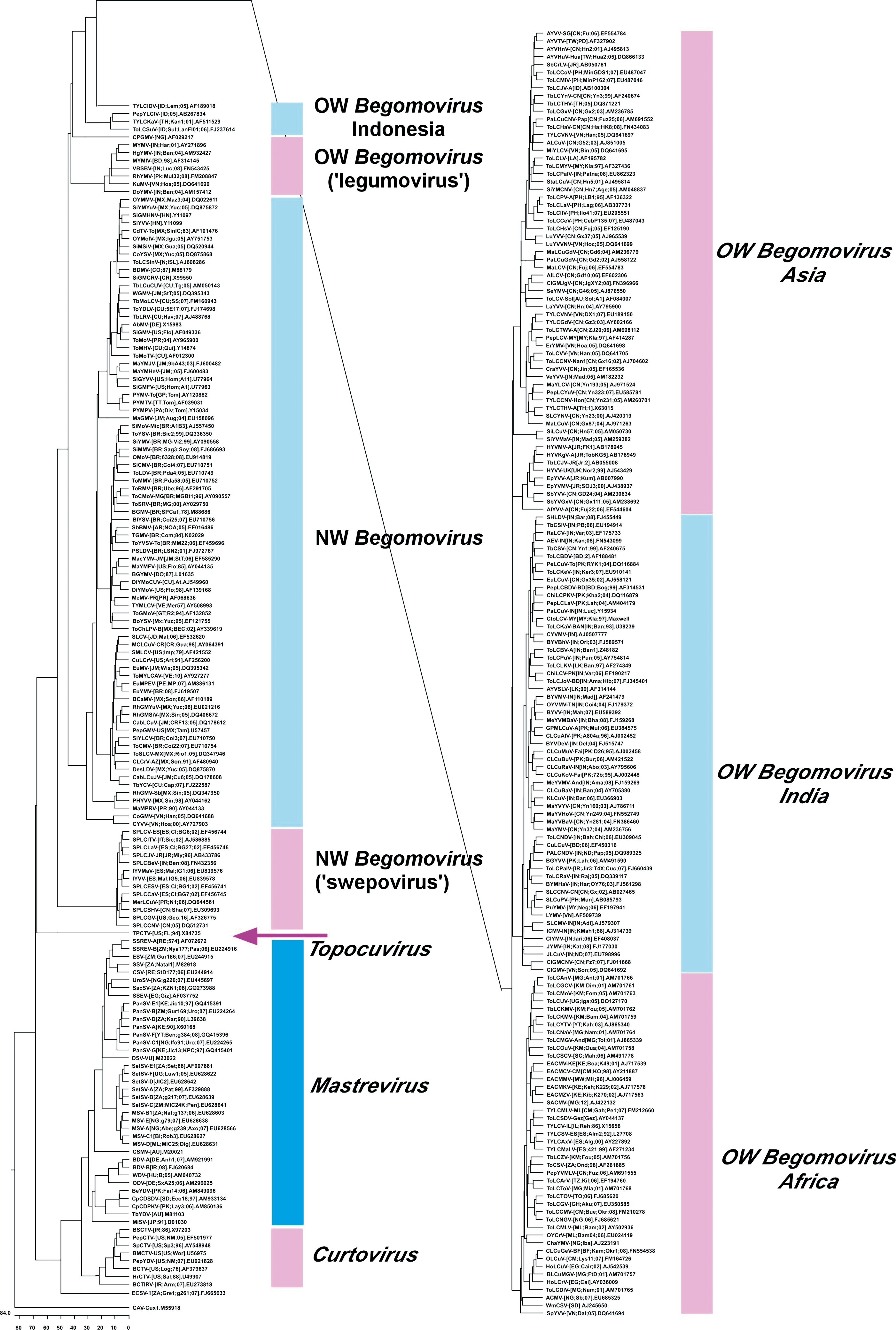 Figure 6 Dendrogram based on the complete DNA (or DNA A) component nucleotide sequences representing 215 approved and 103 candidate species of geminiviruses. Accession numbers and nucleotide sequences were obtained from GenBank. Sequences were aligned using the clustal algorithm (MegAlign 3.11, DNAstar) and the bootstrap analysis was done with PAUP 4.0. The vertical axis is arbitrary and the horizontal axis represents a distance expressed in percentage of nucleotide substitution 100. NW, New World; OW, Old World.