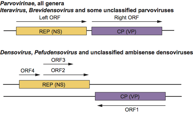 Figure 2 Gene organization for members of the monosense subfamily Parvovirinae, the genera Iteravirus and Brevidensovirus, and some unassigned parvoviruses (top). Gene organization for the ambisense densoviruses and some unassigned densoviruses (bottom).