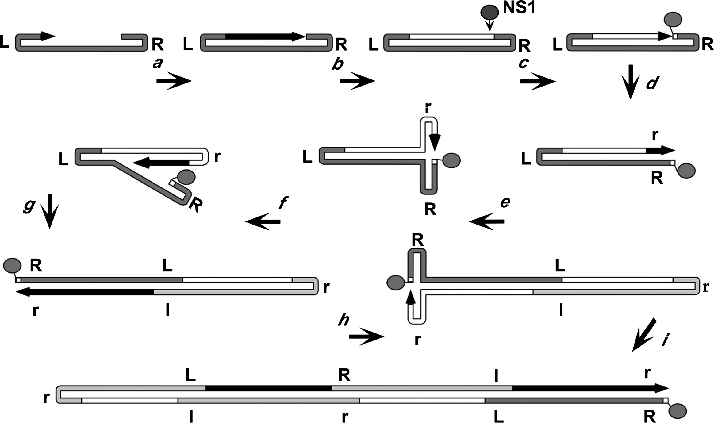 Figure 3 DNA replication model as determined for minute virus of mice (MVM). The newly synthesized DNA of the growing 3 end is represented by a black arrowed line, with the original genome in dark grey. Light grey denotes progeny genomes embedded within the oligomeric intermediates. Upper and lower cases of R and L represent flip and flop forms of the right and left ends, respectively. For details see the text.
