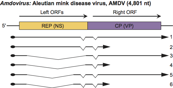 Figure 7 Gene organization and transcription scheme for the member of the genus Amdovirus, as shown for Aleutian mink disease virus (AMDV). Genes are shown as boxes. The left ends of the mRNAs (thick lines) are the sites of the mRNA caps (filled circles), the right ends are the polyadenylation sites (arrows); introns are indicated by thin lines (1=R1; 2=R1; 3=R2; 4=R2; 5=Rx; 6=Rx).