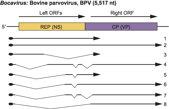 Figure 8 Gene organization and transcription scheme for members of the genus Bocavirus, as shown for bovine parvovirus (BPV). Genes are shown as boxes. The left ends of the mRNAs (thick lines) are the sites of the mRNA caps (filled circles), the right ends are the polyadenylation sites (arrows); introns are indicated by thin lines
