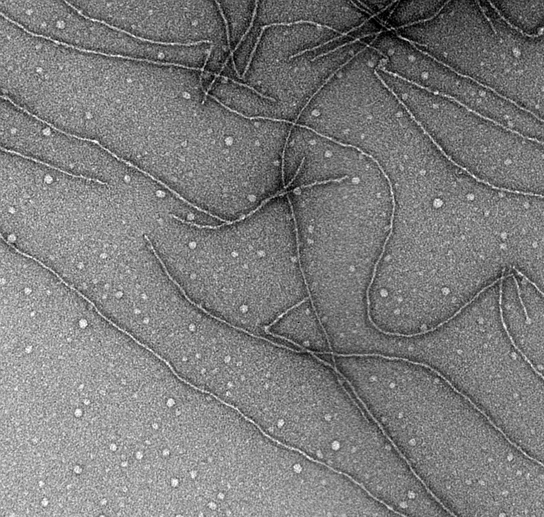 Figure 1 Amyloid filaments of the Sup35 protein prion domain (courtesy of Dr Frank Shewmaker, NIH). Amyloid is a filamentous protein polymer, with strands perpendicular to the long axis of the filament, relative protease-resistance of the protein and special dye staining properties.