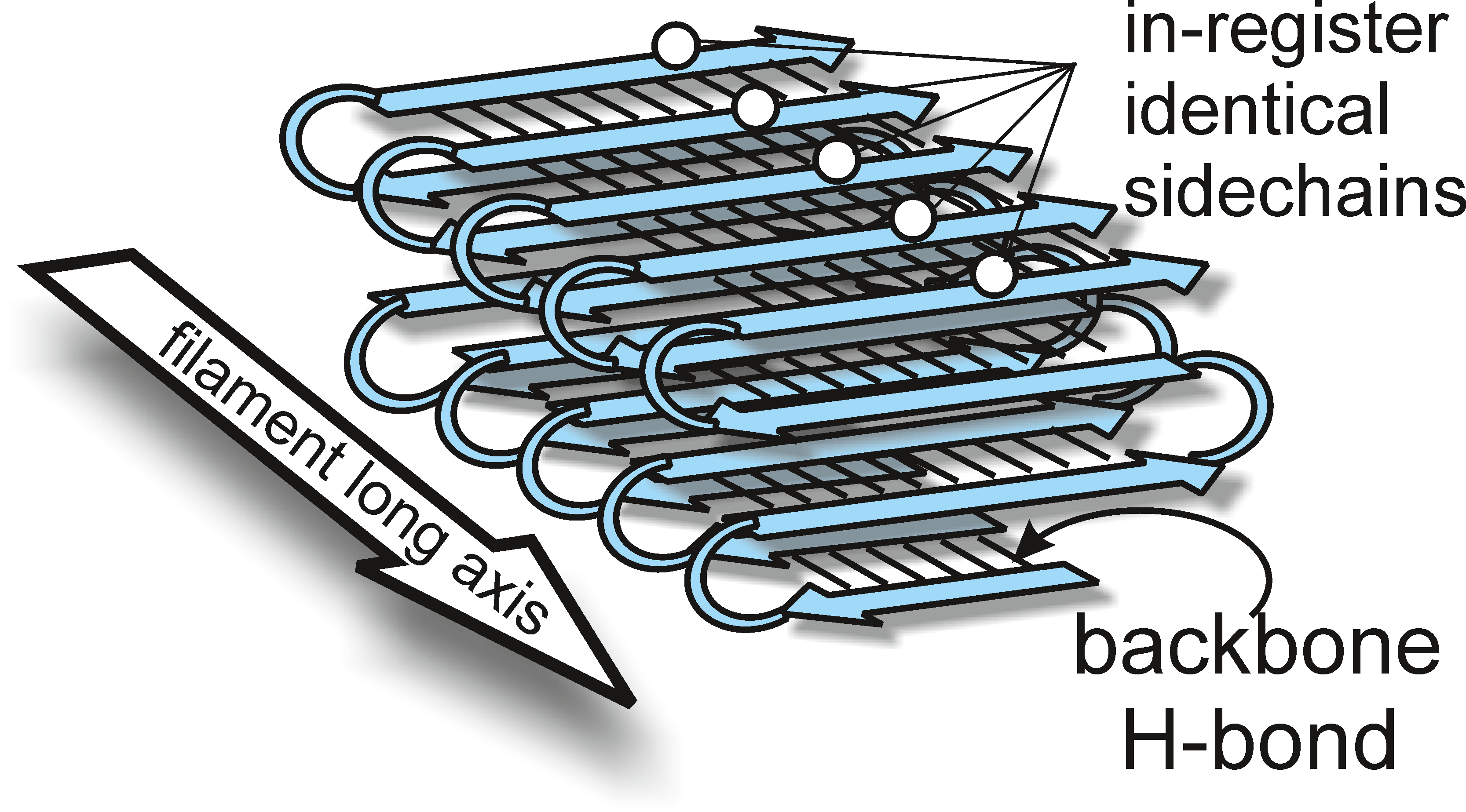 Figure 2 Architecture of yeast prion amyloid filaments is an in-register parallel -sheet. The side chains of each residue form a row along the long axis of the filaments, and interactions among these identical side chains, such as the -zipper of glutamine or asparagine side chains, enforce the in-register structure. The same interactions explain how conformational information is propagated from the filament to new molecules joining the ends.